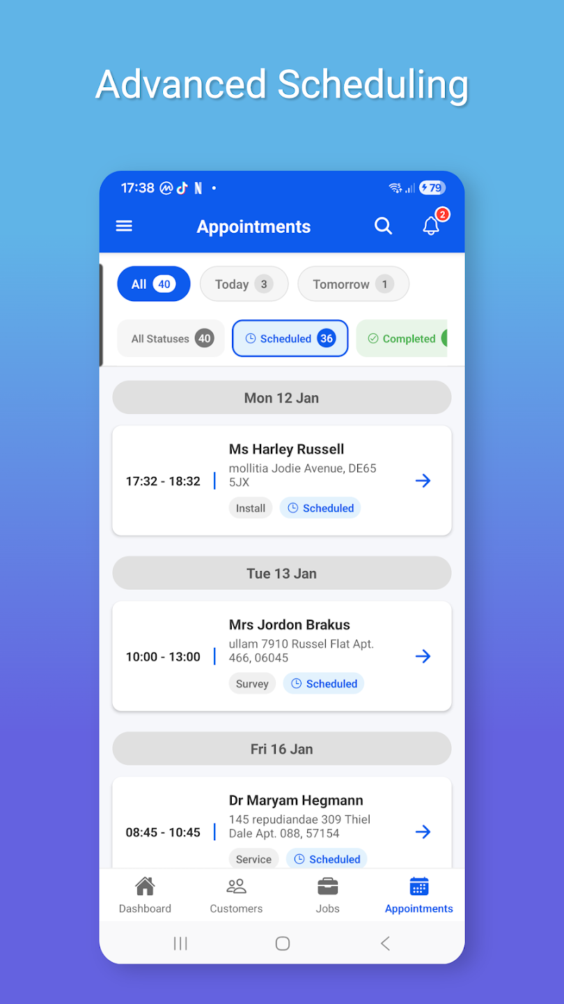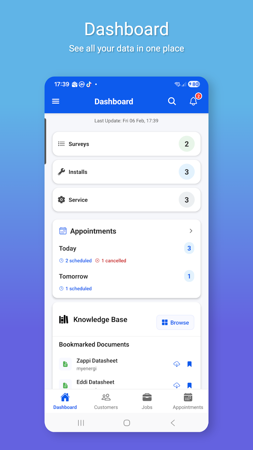 - Clear view of your day: Better visibility of jobs and appointments, so you can prioritise work and stay aligned with the office team.
